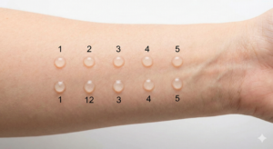 בשלב הראשון, כפי שניתן לראות בתמונה, מונחות על אמת היד טיפות המכילות תמציות של גורמי אלרגיה שונים. כל טיפה ממוספרת כדי שניתן יהיה לזהות איזה חומר נבדק בכל נקודה.