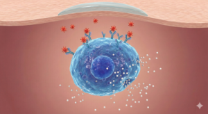 בשלב זה, האלרגן שחדר לעור פוגש את תאי מערכת החיסון. אם קיימת רגישות, האלרגן ייקשר לנוגדנים על פני תאי החיסון, מה שיוביל לשחרור היסטמין ותגובה דלקתית מקומית. תמונה זו ממחישה את התהליך המיקרוסקופי המתרחש מתחת לעור.