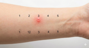 בשלב הסופי, כעבור כ-15-20 דקות, ניתן לראות את התוצאות על פני העור. במקרה של רגישות, תתפתח באזור הדקירה נפיחות מקומית אדומה, הדומה לעקיצת יתוש, כפי שמודגם בתמונה זו.