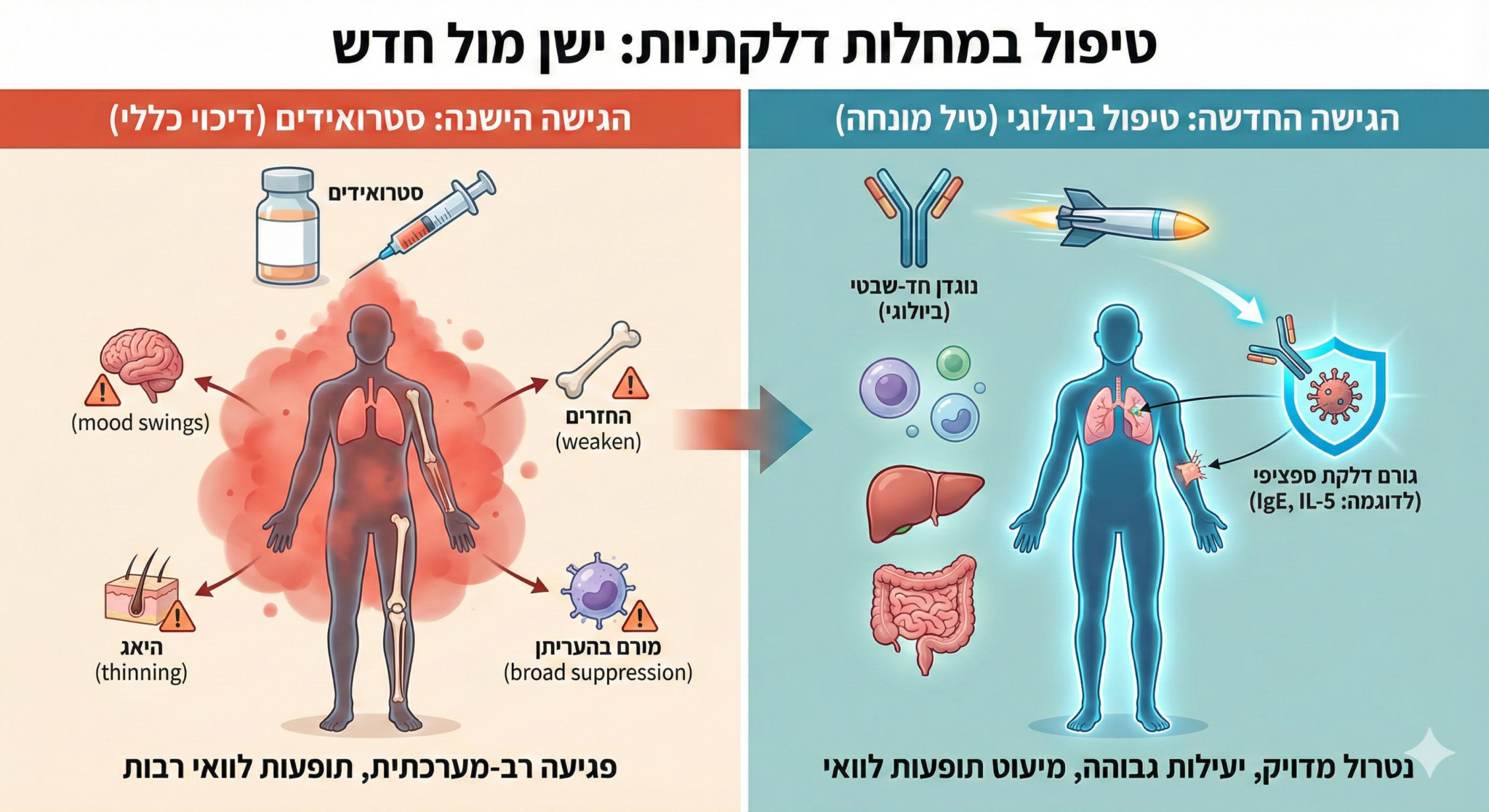טיפולים אלו אינם "מדכאים" את כל המערכת החיסונית (כמו "פצצה"), אלא פועלים כמו "טיל מונחה". הם מנטרלים במדויק רק את המולקולה הספציפית או את התא הספציפי שגורם לדלקת, מבלי לפגוע בשאר מערכות ההגנה של הגוף.