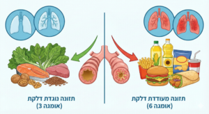 • הצד "הרע" (בעודף): אומגה 6. מצויה בשמנים צמחיים זולים (סויה, תירס, חמניות) ובמזון מעובד. הגוף מפרק אותה לחומצה ארכידונית, וממנה נוצרים לויקוטריאנים – חומרים הגורמים לכיווץ הסימפונות ולהפרשת ליחה (בדיוק החומרים שתרופות כמו "מונטלוקאסט/סינגולייר" מנסות לחסום).