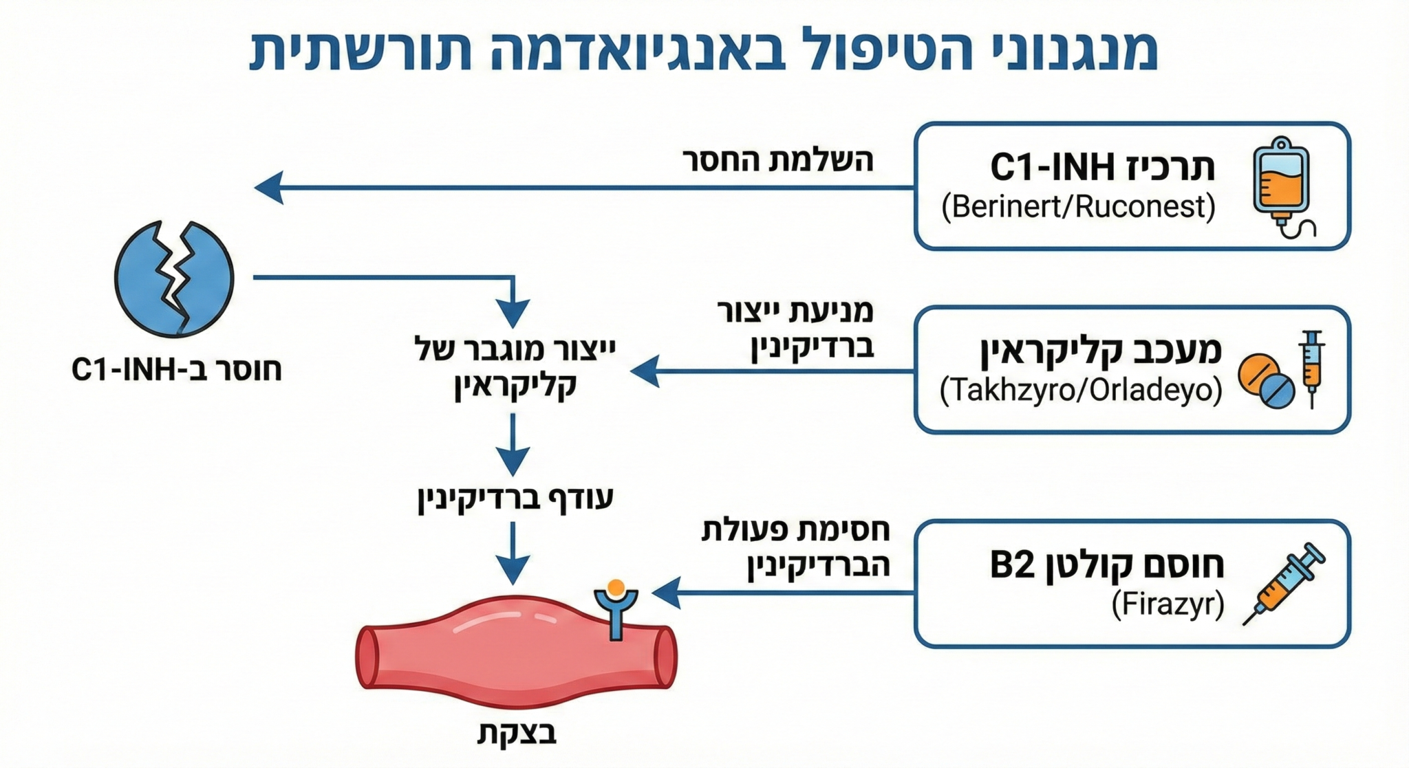 • אורלדיו (Orladeyo): התרופה הראשונה הניתנת בבליעה (כדור יומי). פתרון מצוין לחולים שנרתעים מזריקות ומעדיפים טיפול פומי נוח לשמירה על רמת הגנה קבועה.