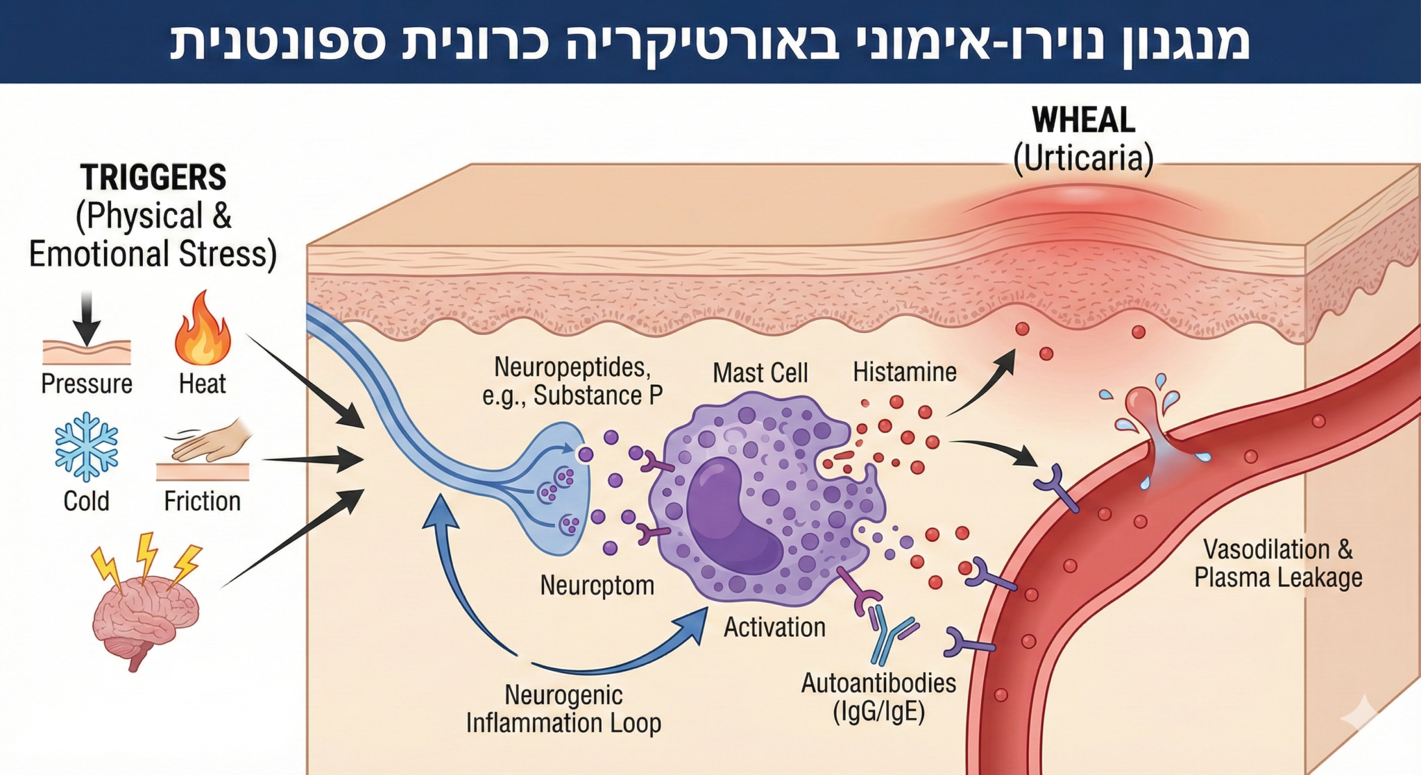 כדי להבין את האורטיקריה הכרונית, עלינו להפסיק לחפש את ה"אלרגן" החיצוני ולהסתכל פנימה. העור שלנו הוא לא רק עטיפה; הוא איבר עשיר בקולטנים עצביים, מתווכים דלקתיים ורשת צפופה של תאי מערכת החיסון (ובעיקר תאי פיטום – Mast Cells).